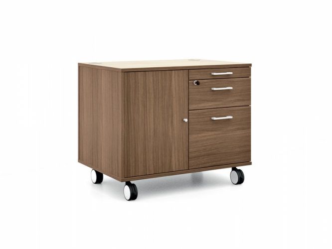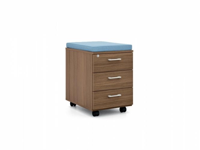 Cajoneras polivalentes rodantes de tres cajones o cajón y archivo con almohadilla para asiento, cajoneras pedestales y armarios contenedores.