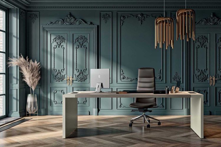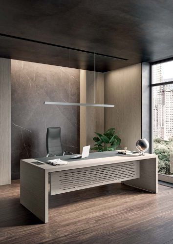 La estructura en haya contrachapada, las patas paneladas lacadas o de madera y la superficie con inserciones de cuero embellecen el modelo ejecutivo, mientras que los accesorios funcionales, como el pasacables, hacen que el escritorio sea práctico de usar, manteniendo una estética formal. e-10 también está disponible en una versión con faldón tallado , para responder a un gusto internacional.