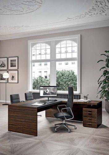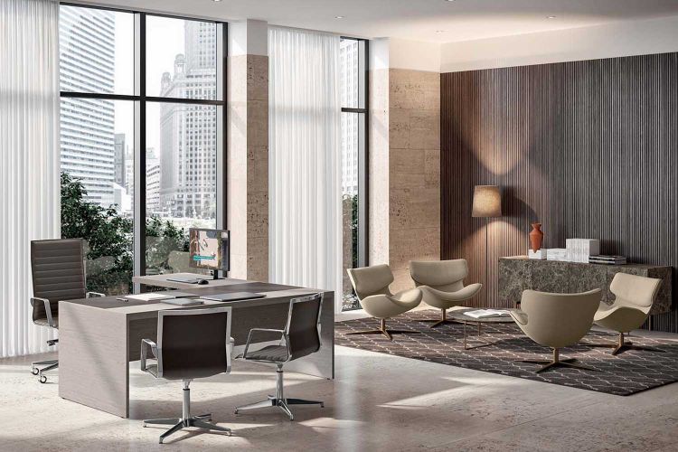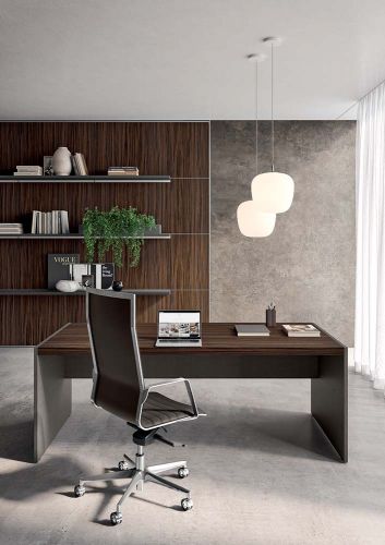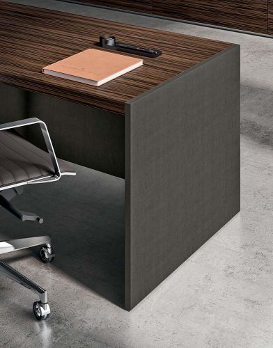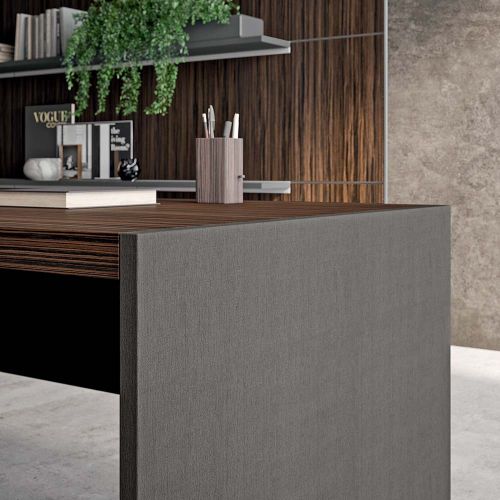 Disponible en varias configuraciones y medidas, el modelo con tablero cuenta con cajones y otros accesorios funcionales. La colección permite crear estéticas contemporáneas gracias a los numerosos acabados disponibles para la superficie y el panel de las patas, como la melamina de color antracita, para expresar mejor la singularidad de cada estilo ejecutivo.
