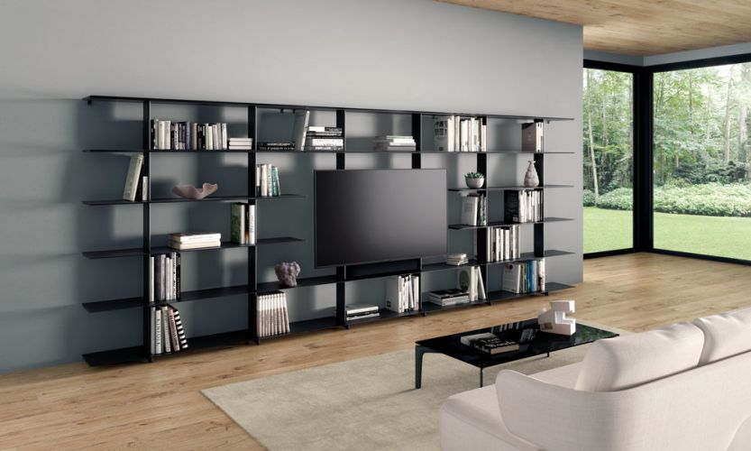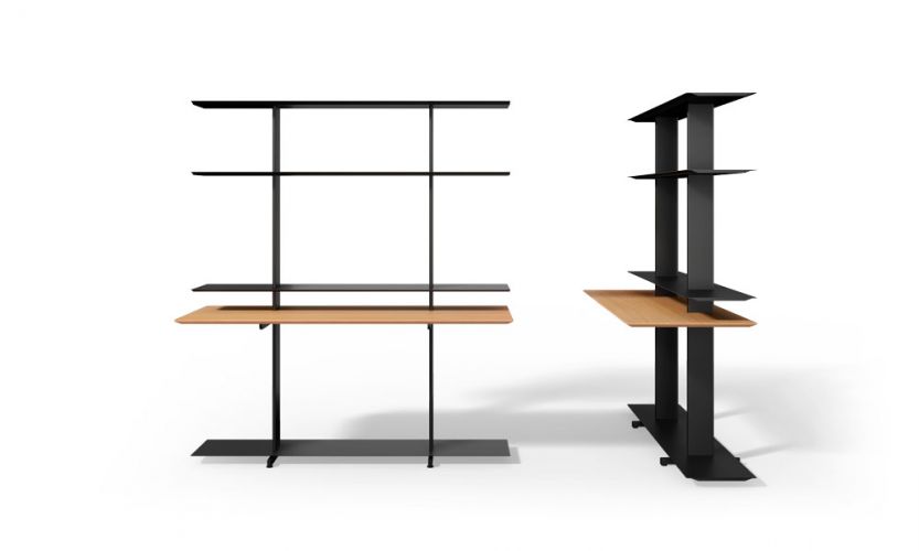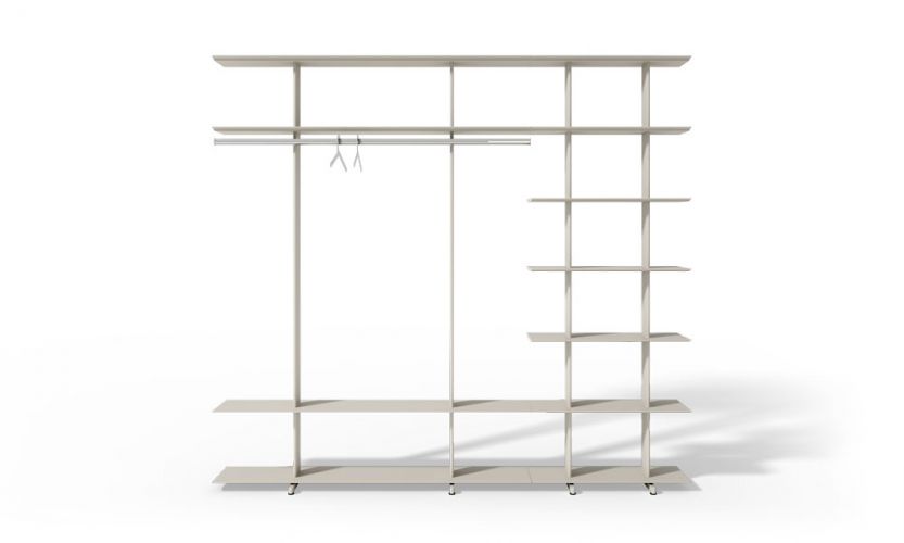 Armario abierto que posibilita al mismo tiempo la organización de ropa, zapatos, bolsos y otros accesorios, gracias a la forma en que combina la barra de colgar con baldas. Pensado para su uso individual o combinado con otras unidades del mismo, así como formando composiciones con las estanterías Wing. Disponible en dos medidas, 1600 y 800 mm; y dos versiones, a pared y autoportante.