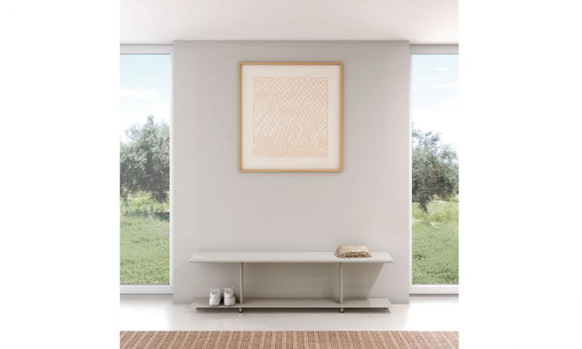 Banco de 1600 mm de longitud con tapicería disponible en tres acabados 100 % reciclados. Ideal para ser ubicado a los pies de una cama. Este mueble es un práctico dos en uno: al ser tapizado, resulta un asiento confortable y, gracias a su repisa inferior, ofrece un espacio extra para guardar plaids, zapatos, cojines, libros y otros objetos