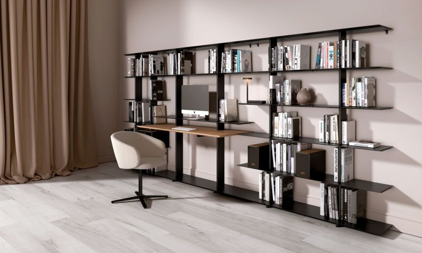 Escritorio de 1600 mm de longitud cuyas baldas permiten la colocación de libros, materiales de oficina, etc. Con este mueble, la colección refuerza su posible uso como pieza clave para ejercer el teletrabajo desde casa. Pensado para su uso individual o formando composiciones con las estanterías Wing.