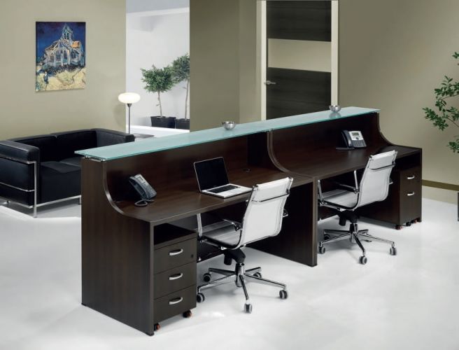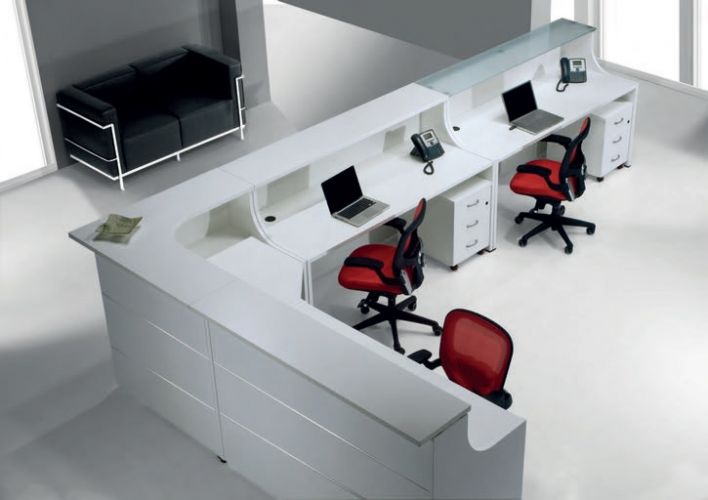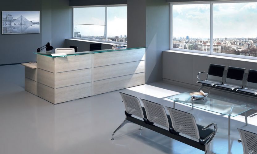 El doble cerramiento lateral, permite que los módulos sean totalmente independientes, pudiéndolos combinar de forma sencilla con otros para crear amplias recepciones multipuesto. Las encimeras se fabrican en bilaminado o cristal matizado de 6+6 mms.