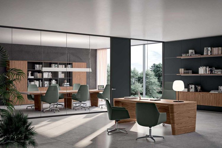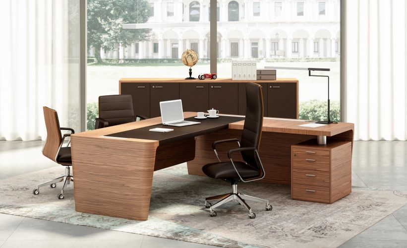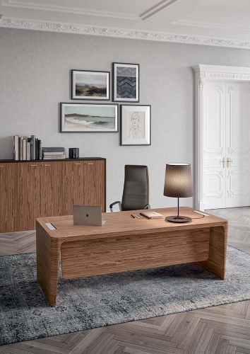 Elogio del equilibrio entre materia y forma. Los escritorios dan prioridad a la elegancia de las formas y a la riqueza en la composición de los volúmenes, transformándose de forma inmediata en símbolo de la modernidad. Elementos rigurosos, contrastes visuales, líneas inclinadas y juegos de composición delimitan las superficies del escritorio de dirección. Matericidad y tonalidades elegantes para el gusto del director contemporáneo.